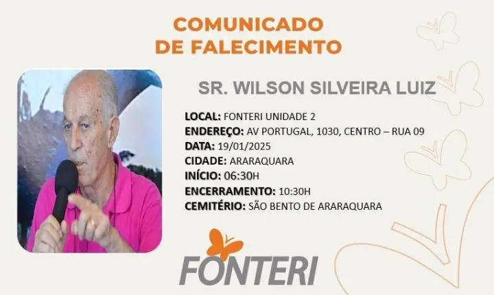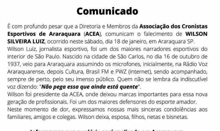 Faleceu o Mestre ,amigo em Cristo e Jornalista Esportivo Wilson Luiz ,de infarto fulminante,aos 87 anos de vida neste Sábado 18/01 em Araraquara.