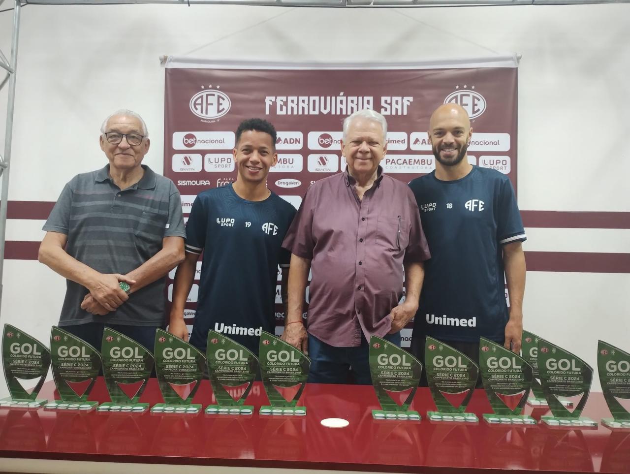 Foto 4 -Prêmio Gol Colorido Futura e Aquarela Tintas com Adélcio Magrini da Aquarela Tintas e os jogadores da Ferroviária.