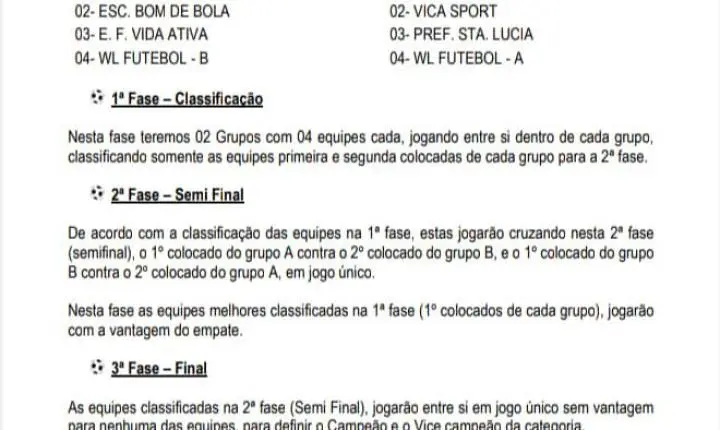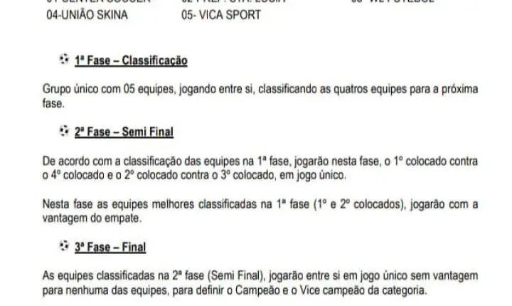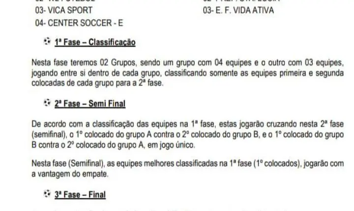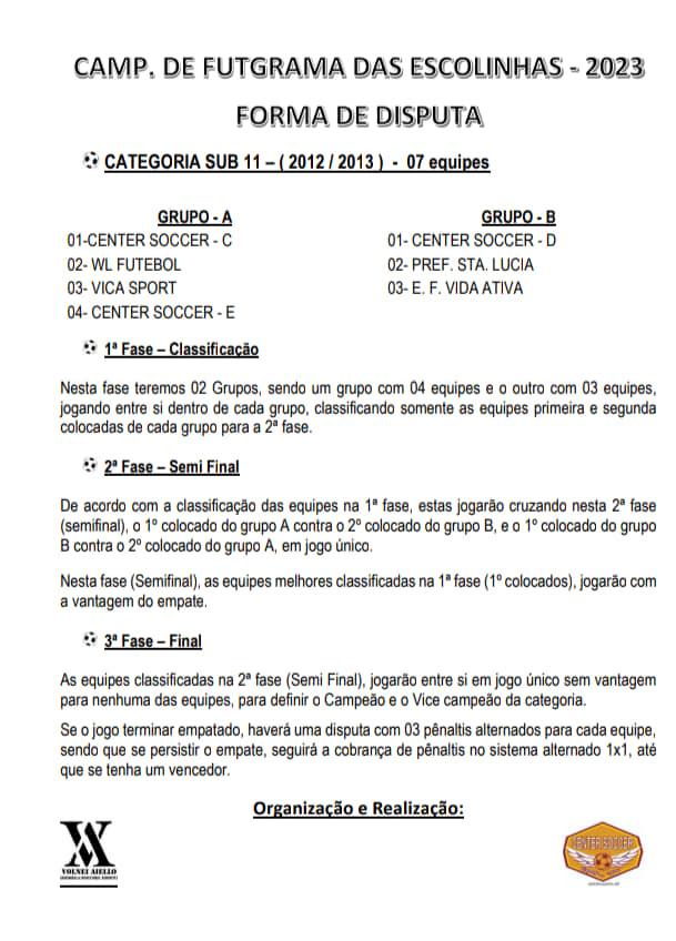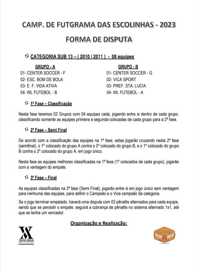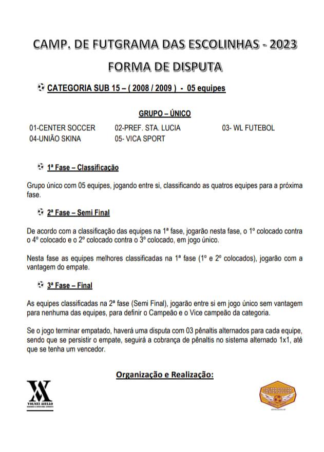 São 5 categorias :Sub 07 , Sub 09 ,Sub 11 , Sub 13 e Sub 15. Jogos com dois tempos de 15 minutos cada.Está e a fase de classificação.